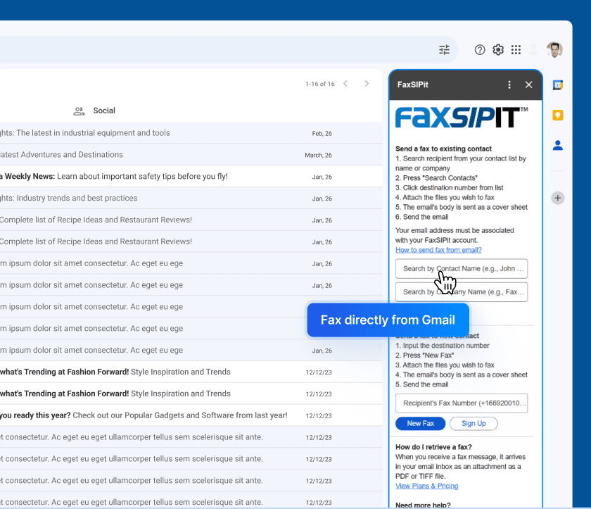 FaxSIPit adds fax options into the Gmail interface so users can send fax directly from Gmail after signing in with their Google Workspace account.